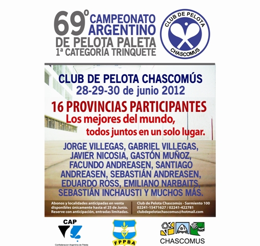 En la ciudad de Chascomús, del 28 al 30 de Julio, se disputara el 69° Campeonato Argentino de Trinquete de Mayores.