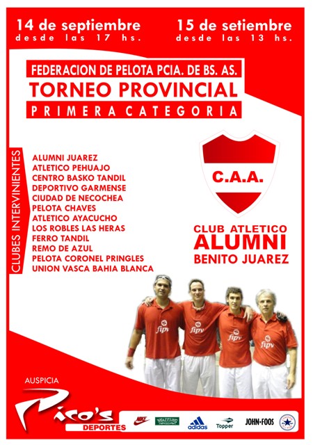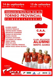 Este Viernes y Sábado, 14 y 15 de Septiembre, se juega la 2da fecha del Clausura del Torneo que organiza la FPPBA. En el Club Alumni de Juárez se presentarán las figuras de la Pelota Paleta para participar en una nueva fecha del Provincial y brindar, seguramente, otro Gran Espectáculo Pelotari.
